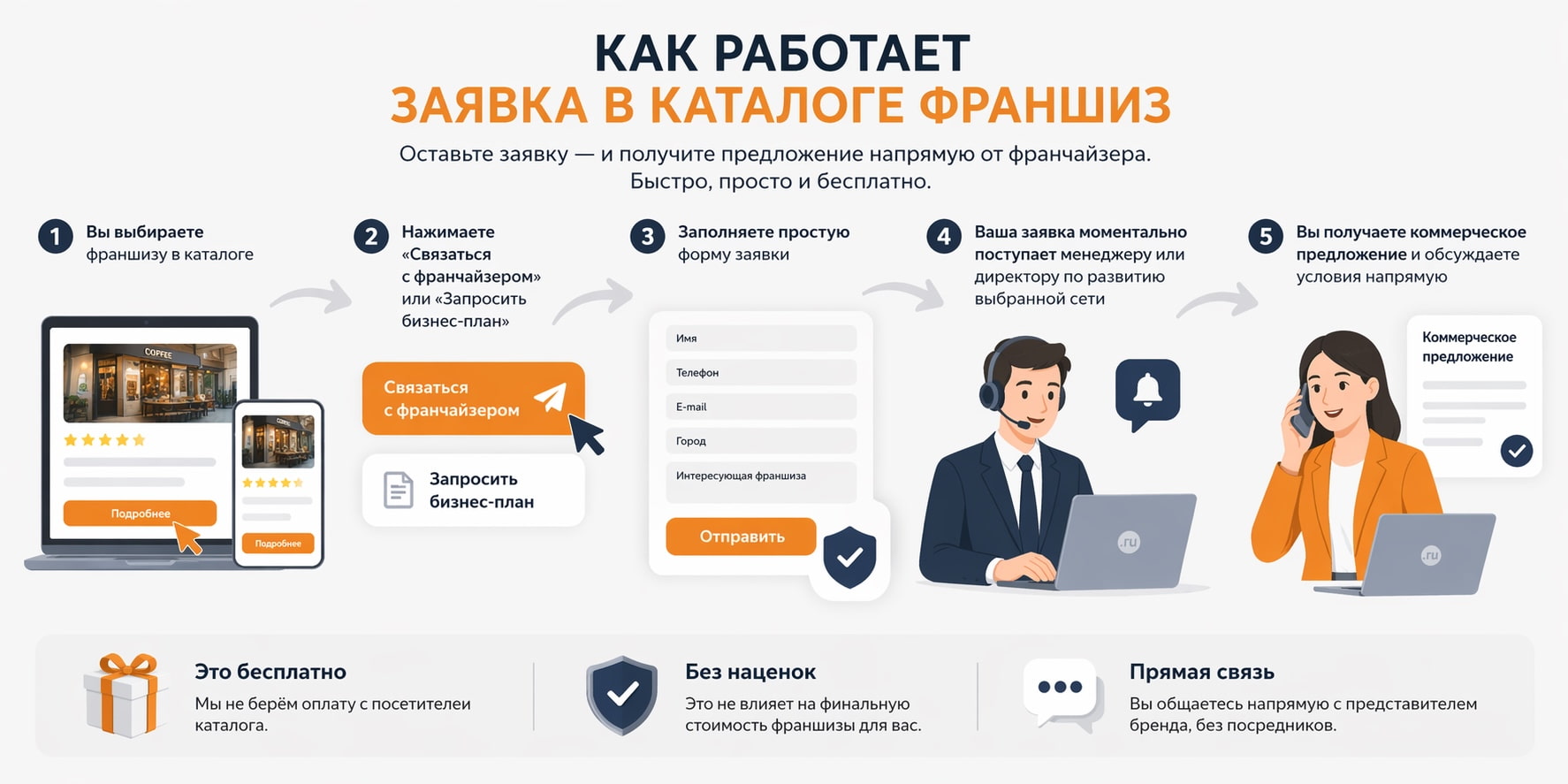"После заполнения Ваша заявка моментально попадает к менеджеру или директору по развитию той сети, которой Вы ее адресовали, и Вы получаете от него коммерческое предложение. Оплату с посетителей каталога за это мы не берем и на финальную стоимость франшизы для Вас это не влияет.На странице каждой франшизы в нашем каталоге есть активные кнопки «Связаться с франчайзером», «Запросить бизнес-план» - это и есть Ваша прямая связь с представителем бренда."