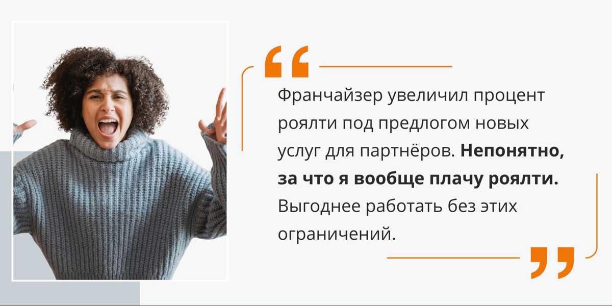 Что говорит партнер. УК обещала помогать, поддерживать мой маркетинг, а вместо этого усиливает давление и говорит, что я плохо работаю. Требует поднять цены, не понимая специфики локации. К тому же увеличила процент роялти под предлогом новых услуг для партнеров. Непонятно, за что я вообще плачу роялти. Выгоднее работать без этих ограничений.