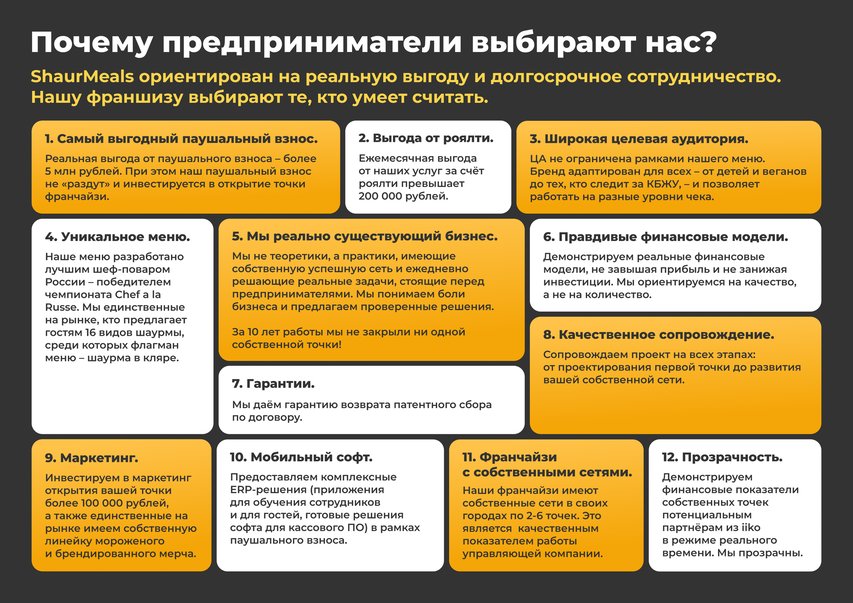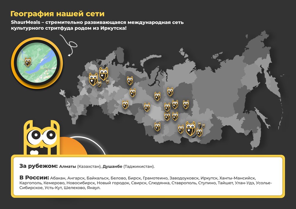 11. Обучение франчайзи в заведениях нашей собственной сети в Иркутске. Мы проведём экскурсию по нашим точкам, ответим на вопросы, расскажем о внутренних операционных процессах. Наш шеф-повар обучит вас основам приготовления блюд, а также вы узнаете обо всех стандартах сервиса сети ShaurMeals и обучитесь кассовой дисциплине. Мы оплатим 3 ночи вашего проживания в гостинице (платим за 1 номер). Транспорт вы оплачиваете самостоятельно. Количество человек на обучении – не более трёх.