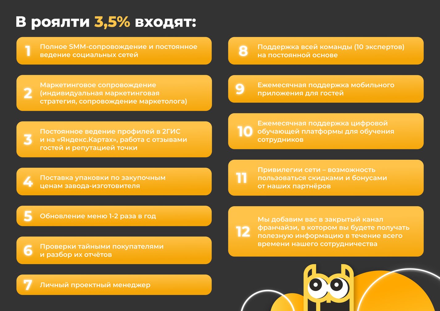 Роялти: 3,5% от оборота в месяц за каждое заведение