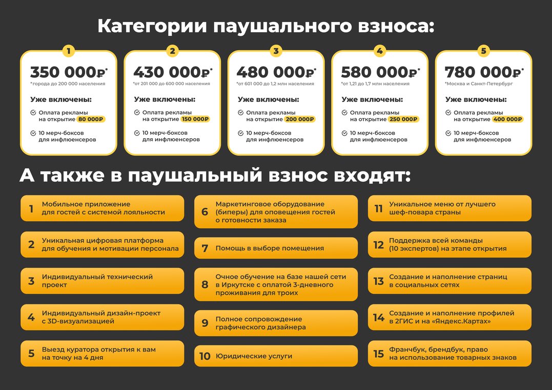 В эту сумму входит паушальный взнос, затраты на ремонт помещения, аренда, закуп оборудования, продуктов и маркетинг.