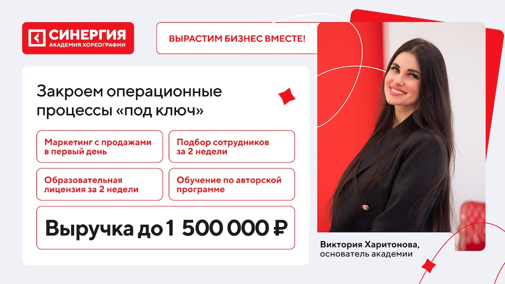 Вы открываете студию под брендом "Синергия", получаете лицензионную программу от примы Кремлёвского балета и полностью готовую модель запуска за 5 недель.