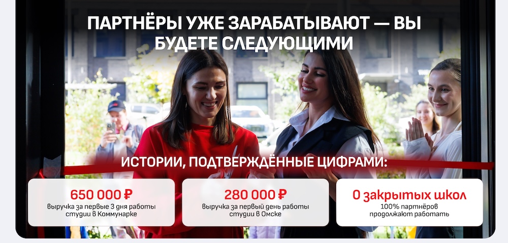 - Средняя чистая прибыль — от 200 000 ₽, партнёры выходят на выручки до 1 500 000 ₽.