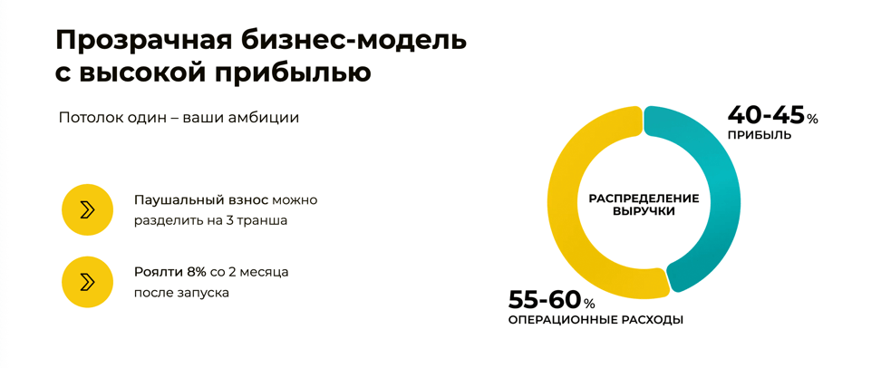 Инвестиции варьируются от 350 000 до 550 000 руб., включая паушальный взнос и стартовые расходы на запуск.