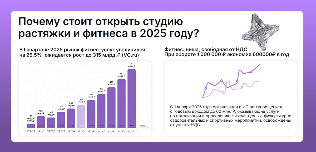 В 2023 году наша франшиза стала лучшей сетью фитнес-студий по версии Russian Fitness Award, франшиза входит в ТОП-100 компаний по России, в нише растяжки в ТОП-1 и ТОП-3 рейтингов студий стретчинга в 2025, 2025 годах.