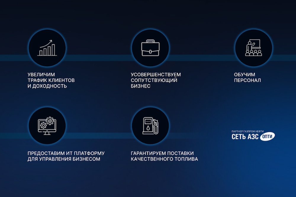 - Гибкий формат для разного масштаба бизнеса: "ОПТИ" подходит для небольших независимых АЗС, сетевых операторов и новых точек – индивидуальный подход к формату и условиям подключения.