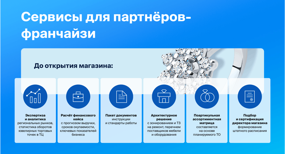 Это готовая бизнес-модель ювелирного магазина под федеральным брендом с обучение, маркетингом и поддержкой франчайзера.