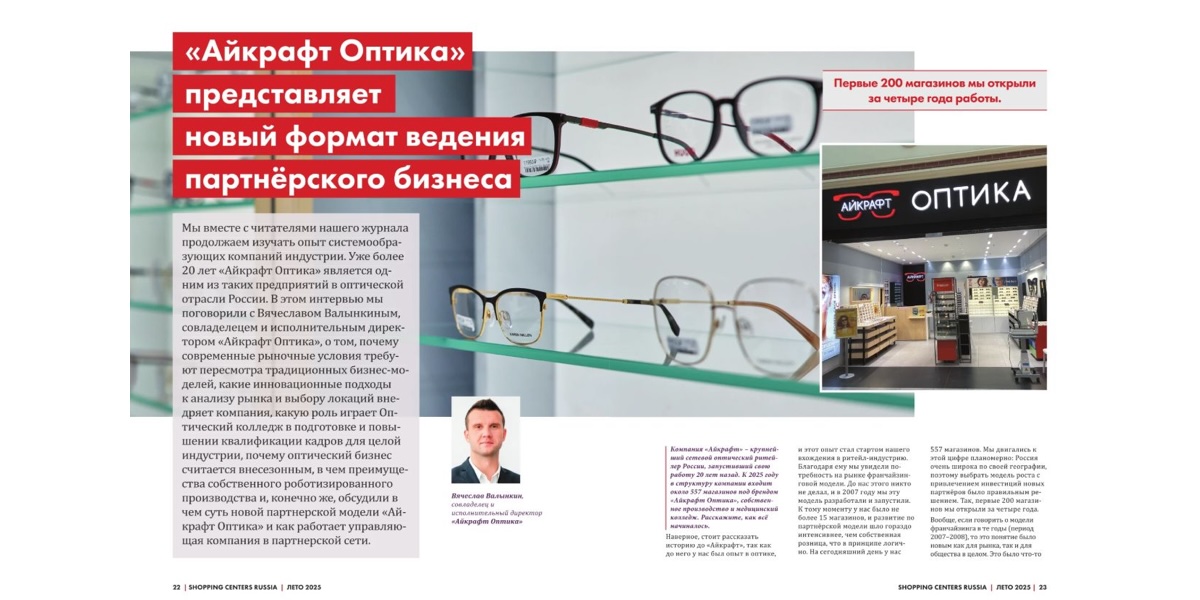 Компания "Айкрафт", начавшая свой путь с нескольких салонов и амбициозной идеи предоставить доступную и качественную оптику в современном формате, сегодня уверенно занимает лидирующие позиции на российском рынке. На данный момент сеть насчитывает 557 магазинов по всей стране, и этот рост стал возможен благодаря стратегическому подходу и инновациям.