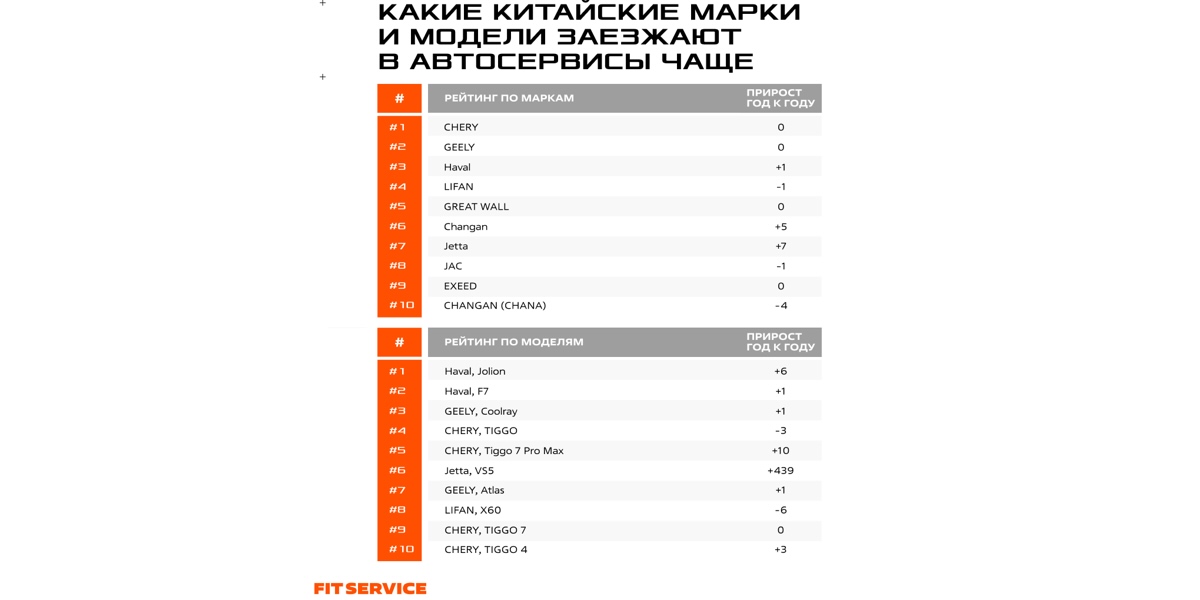 Согласно результатам исследования, частота машино-заездов выросла на 53%. Чаще других заезжают автомобили возрастом до 3 лет, где прирост составил 112%, и машины возрастом 4–5 лет, где показатель увеличился на 110%. Часть авто, обслуживаемых в сервисах FIT SERVICE, составила 6%, что в 2 раза превышает результат прошедшего года (3%). В текущем году в FIT SERVICE заехало более 35 тысяч авто.
